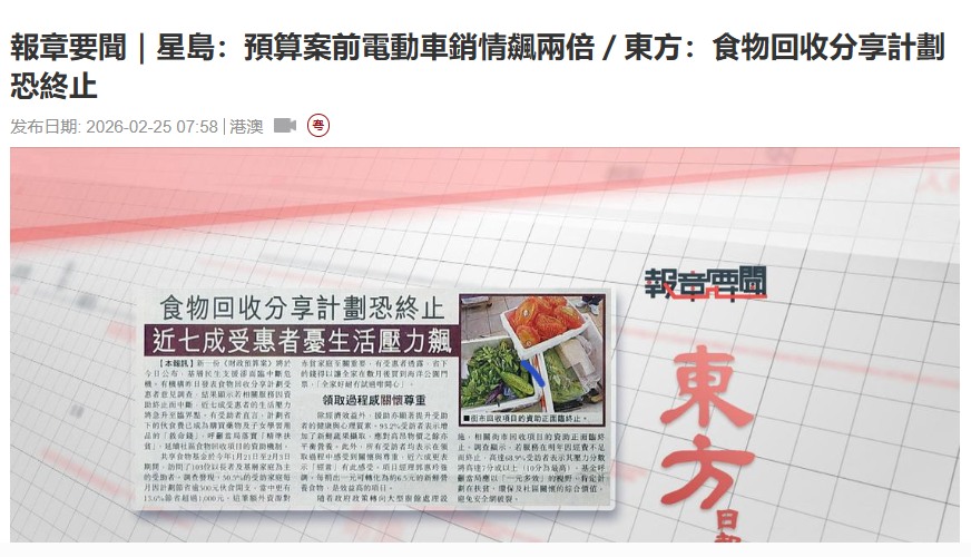 Newspaper News | Sing Tao Daily: Electric vehicle sales double before budget / Oriental Daily: Food recycling and sharing program may be terminated