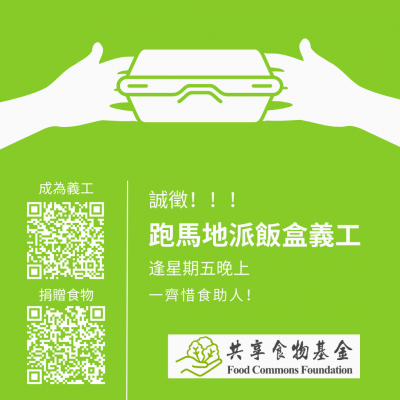 共享食物基金誠徵跑馬地區派發飯盒義工,在星期五晚上8:45分左右接收食店關門送出的飯盒,轉送街坊即時食用,減少食物浪費,同時可幫到有需要人士。